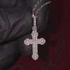 This radiant pendant showcases a bold cross design covered in shimmering stones that catch the light from every angle. The detailed craftsmanship gives it a refined yet powerful look, perfect for any style. Completed with a matching chain, it brings a timeless symbol of faith and elegance together in one striking piece.